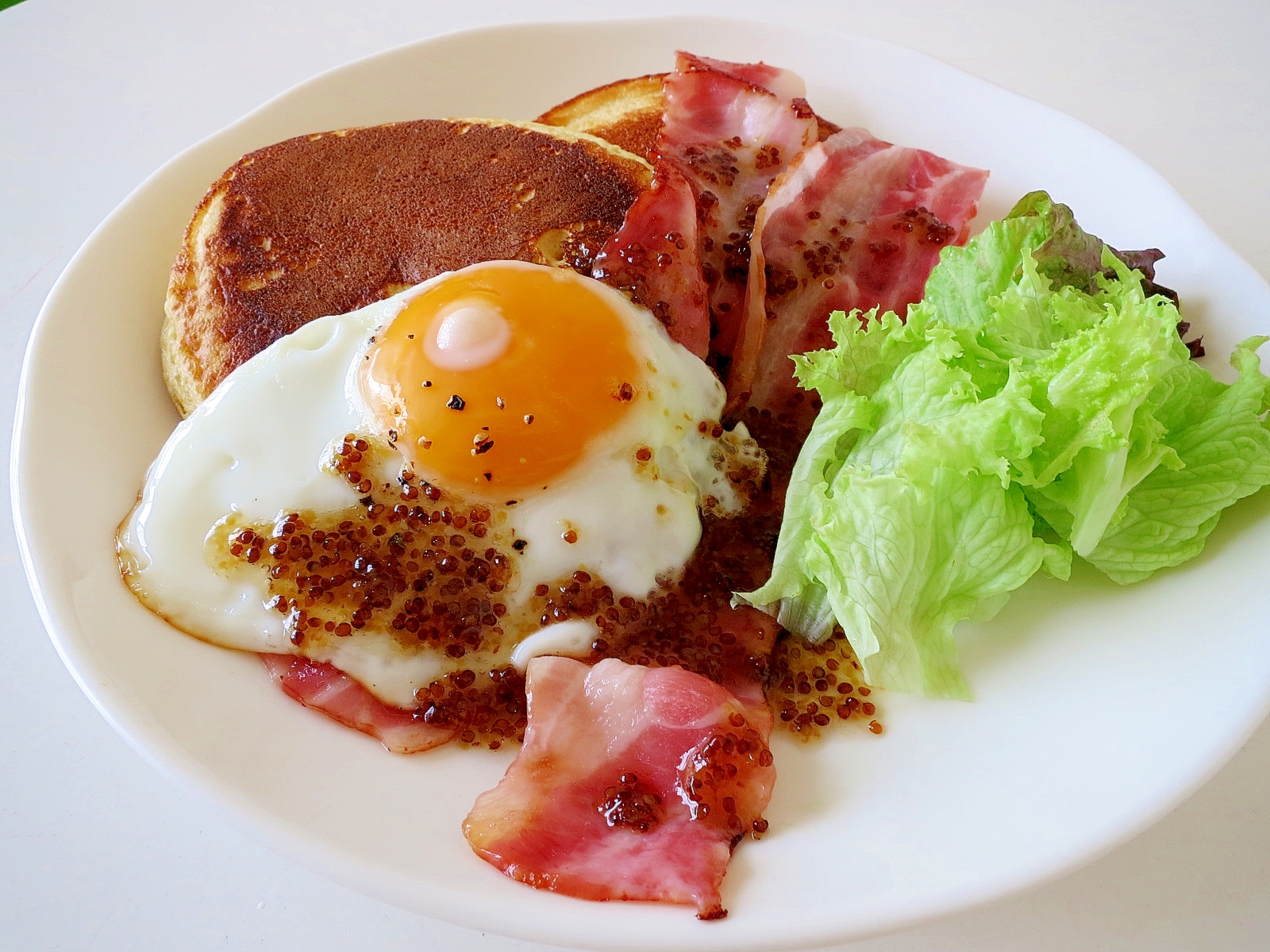 ベーコンエッグとパンケーキのハニーマスタードかけ レシピ 作り方 By だるま72936 楽天レシピ